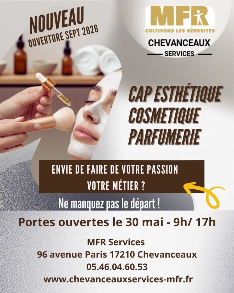 MFR Chevanceaux Envie de faire de votre passion votre métier ? + Ajouter à mon Agenda Google + iCal / Outlook export 00 jours 00 heures 00 minutes 00 secondes Date 30 Mai 2026 Heure 09:00 - 17:00 Partagez cet événement avril 2026 Avr 26 2026 Fête du pain Avr 26 2026 Thé dansant salle des fêtes Avr 28 2026 Entreprendre » sans rester seul » mai 2026 Mai 29 - 30 2026 Don du sang Saint Germain de Lusignan Mai 30 2026 Rando culs salés Mai 30 2026 MFR Chevanceaux Pas d'événement actuellement programmé.
